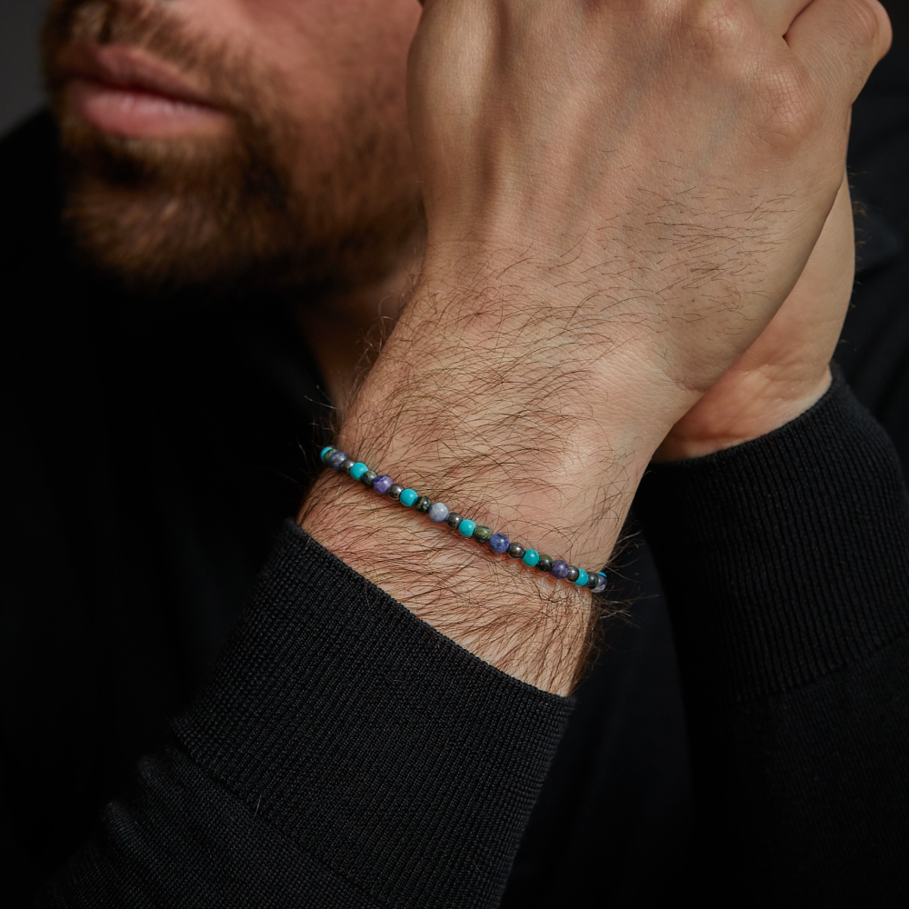 Armband van het merk Rebel & Rose. De armband heeft een hoogwaardige elastische stretch koord, met 4mm van Art. Turquoise, Ryoliet, Sodaliet, Hematiet.