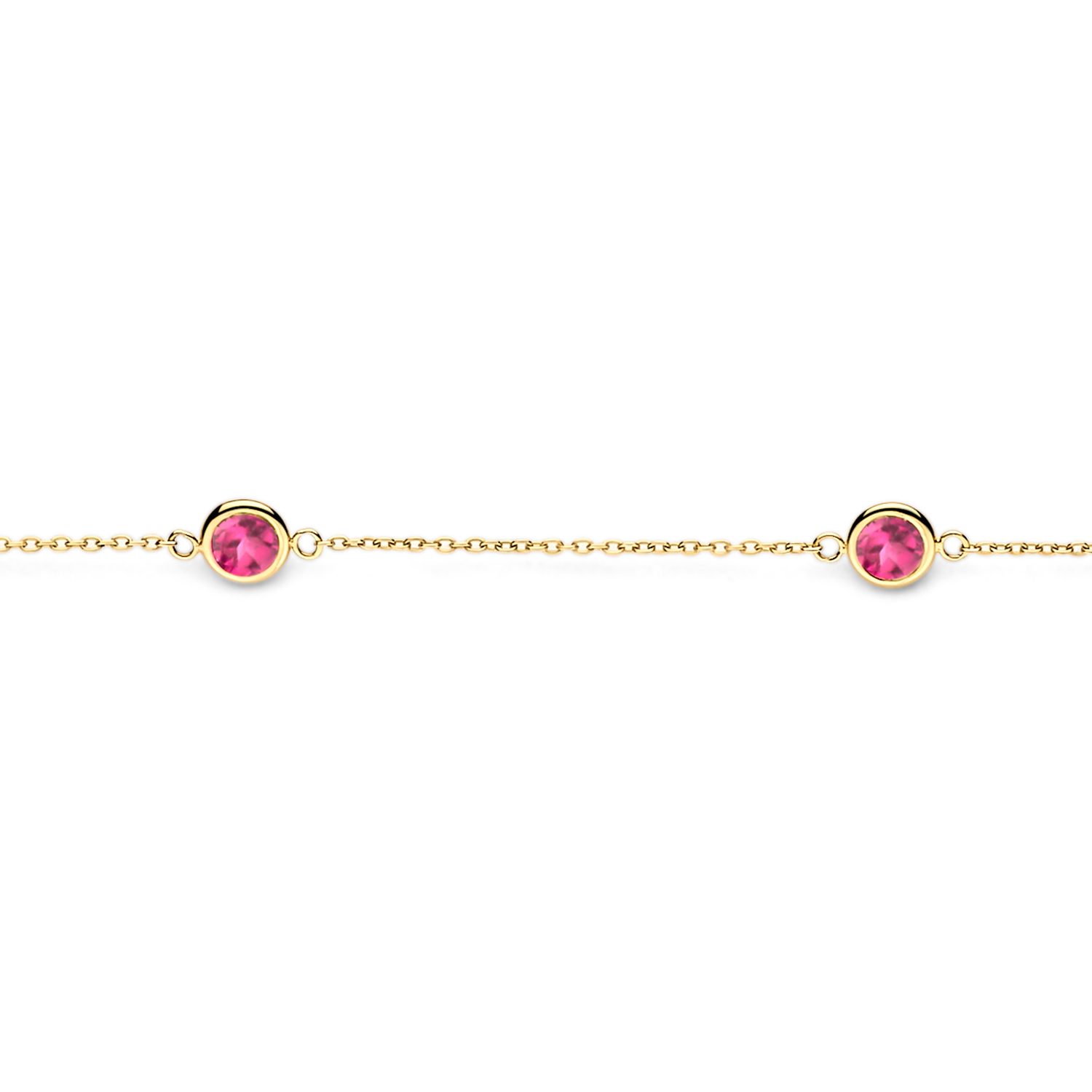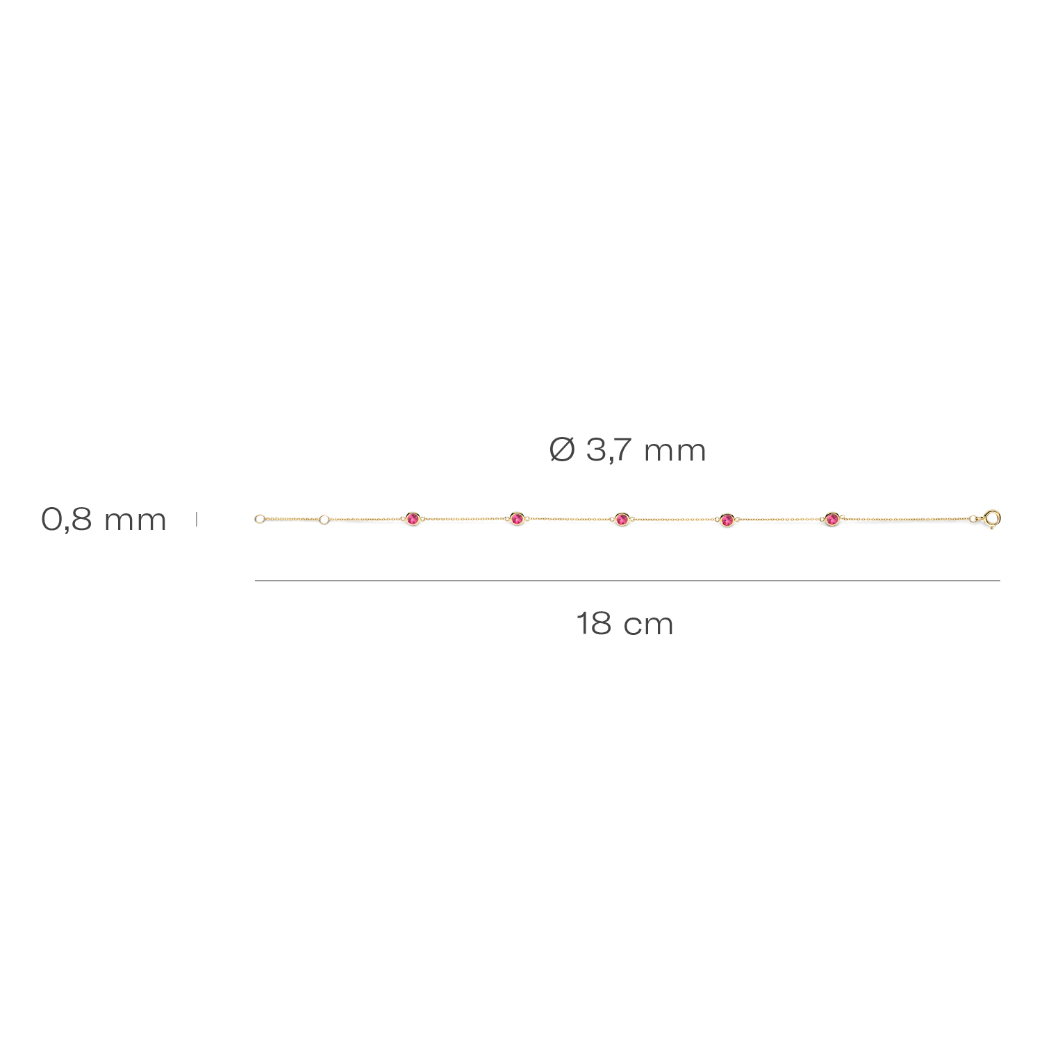 De delicate geel gouden anker schakel, met een diameter van 0.8 mm, is verrijkt met vijf schitterende rhodolietjesElk rond geslepen peridoot is elegant gezet in een gladomzetting, waardoor ze prachtig opvallen.