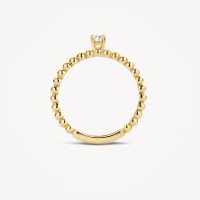 Een deel van de band van deze 14k geelgouden ring met zirkonia in chatonzetting heeft een speels bolletjesmotief. De band is 2 mm breed en de zirkonia heeft een doorsnede van 3,5 mm. Mooi te combineren met andere sieraden met zirkonia uit onze collectie.