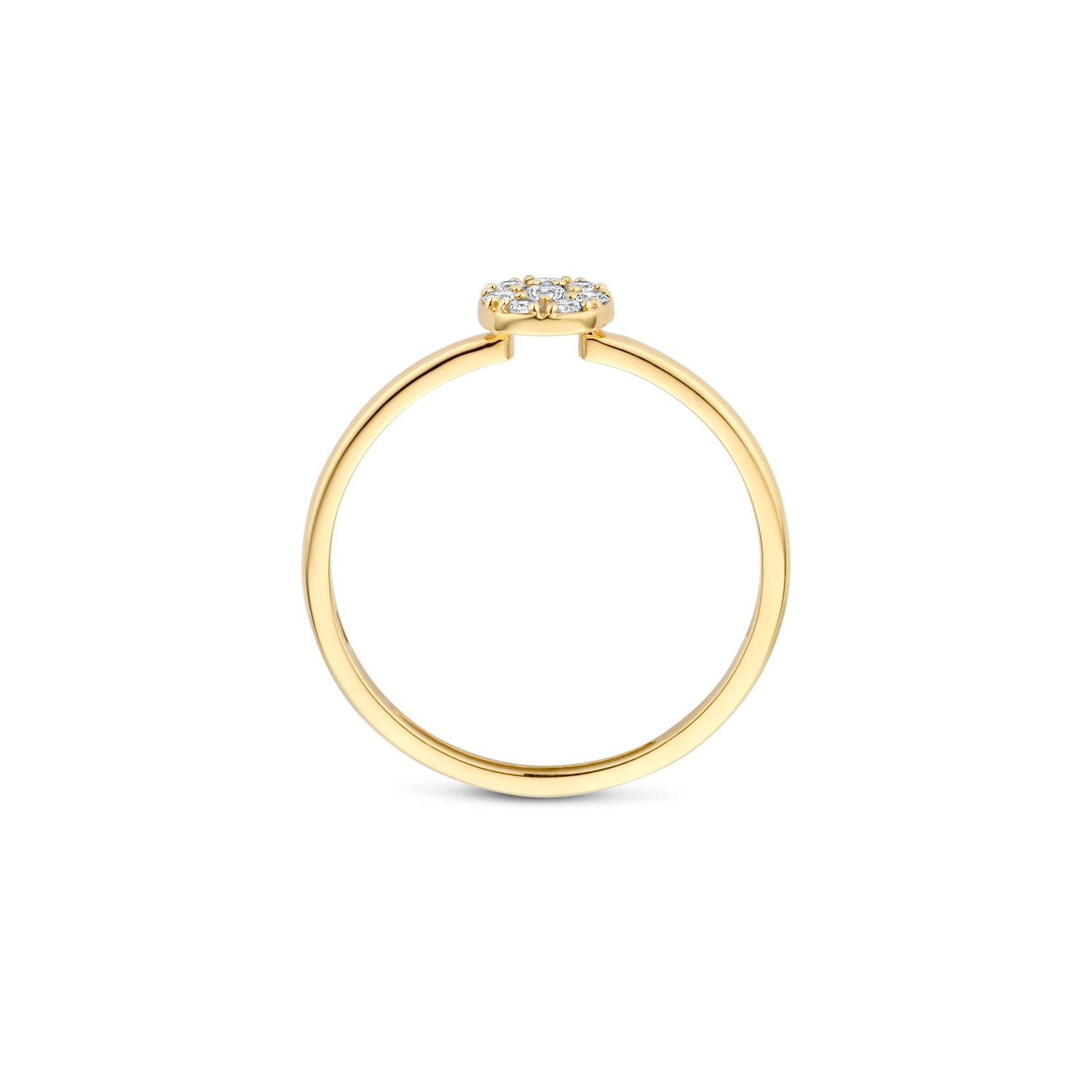 Ontdek deze verfijnde ring, vervaardigd uit 14k geelgoud. Je ziet een slanke band die subtiel overgaat in een cirkelvormig cluster van schitterende zirkonia's. Deze zijn zorgvuldig pavé gezet voor maximale glans. Met een banddikte van ⌀ 1.4 mm draagt hij comfortabel en elegant. Een tijdloze toevoeging aan jouw sieradencollectie.