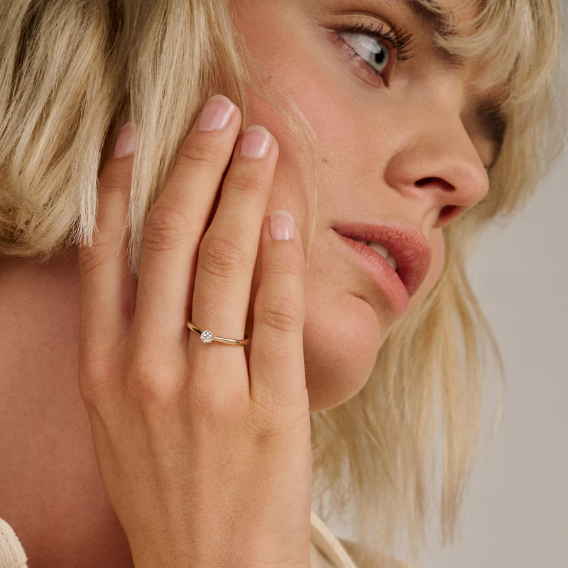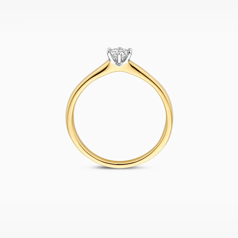 Deze Blush ring is een elegante ring van 14 karaat geelgoud en witgoud met een lab diamant in chaton zetting. Steen grootte: ∅ 4.4 mm en gewicht Diamant (in ct): 0.30.