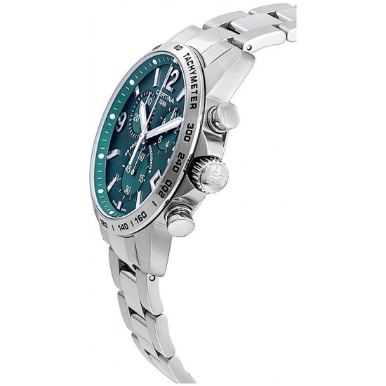 Dit horloge van Certina met referentienummer C0344171109700, heeft een quartz-uurwerk dat geplaatst is in een edelstalen kast. Op de groene wijzerplaat is analoge tijdsweergave zichtbaar. Aan de kast zit een staal- of zilverkleurige stalen horlogeband met een vouwsluiting. Het quartz-uurwerk biedt u datum-aanduiding als tijdfunctie.  Het uurwerk heeft een stopwatch-functie. Het horloge is 100 meter waterdicht en is voorzien van een saffierglas.