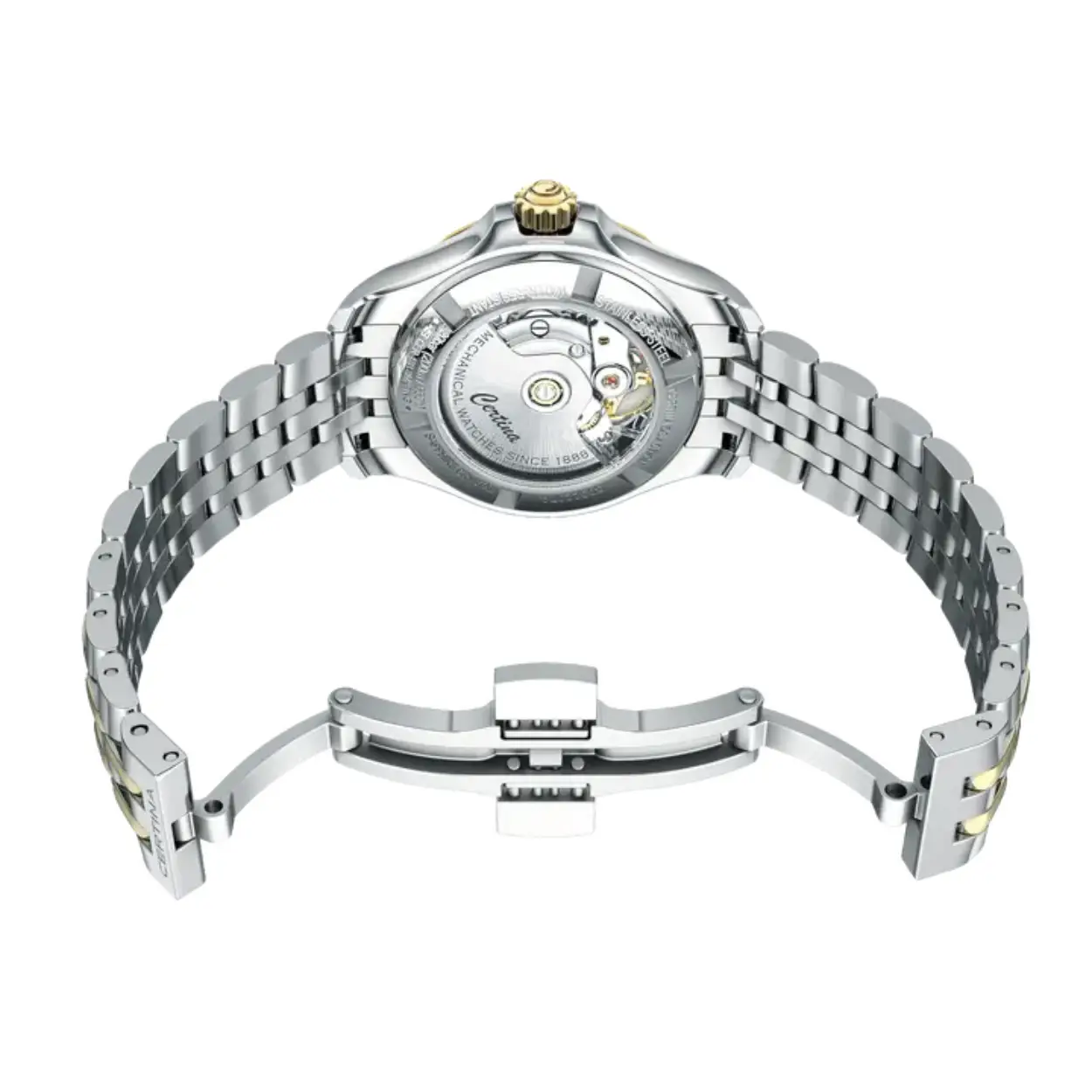 De Certina DS Action Automatic (model C0322072211600) is een luxe dameshorloge met Zwitserse automatische beweging. Het horloge heeft een diameter van 34,5 mm, is waterdicht tot 200 meter, en voorzien van een saffierglas en echte diamanten op de kast. Het gouden/ zilverkleurige ontwerp maakt het ideaal voor zowel formele als informele gelegenheden. Perfect voor een elegante en verfijnde uitstraling.