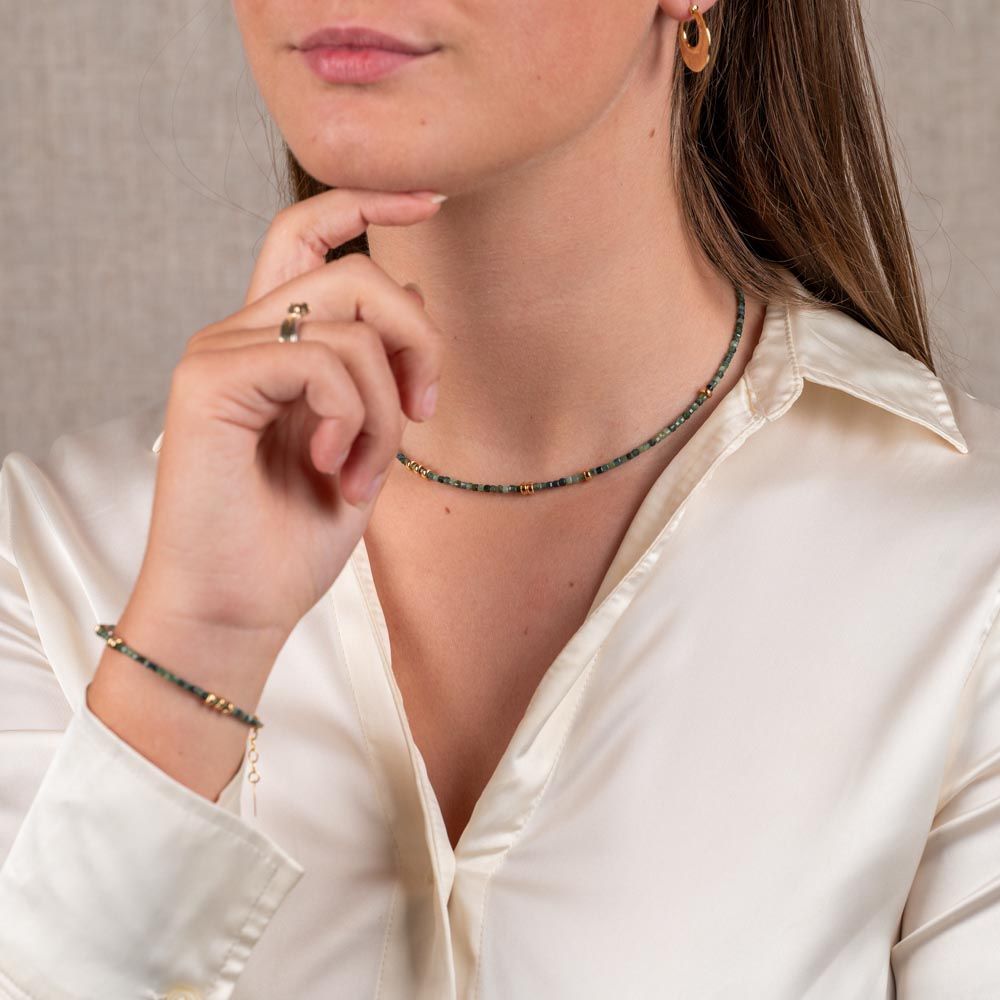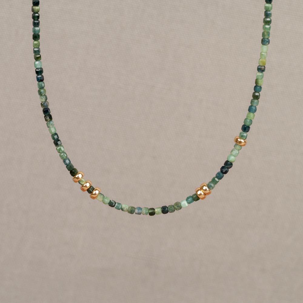 Dit prachtige collier is gemaakt van groene toermalijn stenen en goudgevulde schijfjes. De groene toermalijn staat bekend om zijn helende en beschermende eigenschappen, terwijl de goudgevulde schijfjes een luxe uitstraling toevoegen. Draag dit collier als een statement stuk bij een elegante avondjurk of combineer het met een casual outfit voor een subtiele touch of glamour. Een veelzijdig sieraad voor elke gelegenheid.