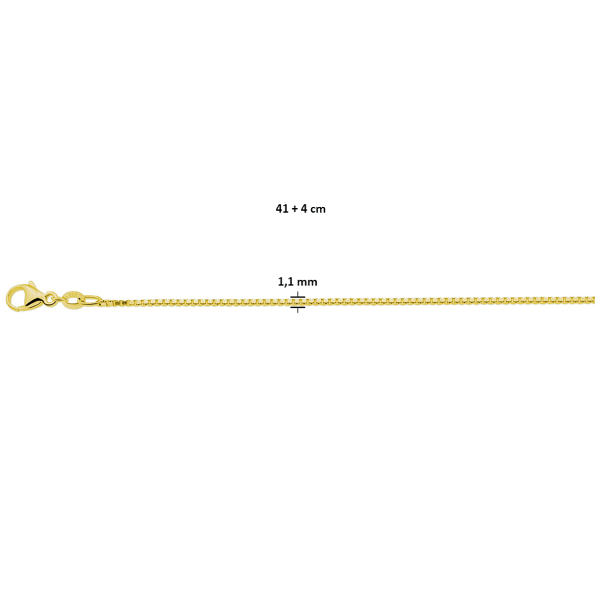 Geelgoud op 925 zilveren collier. De schakelbreedte is 1.1mm. Het collier heeft een draaglengte van 41cm en een extensie van 4cm. Uitgevoerd met een karabijn sluiting. Geen garantie op plating.