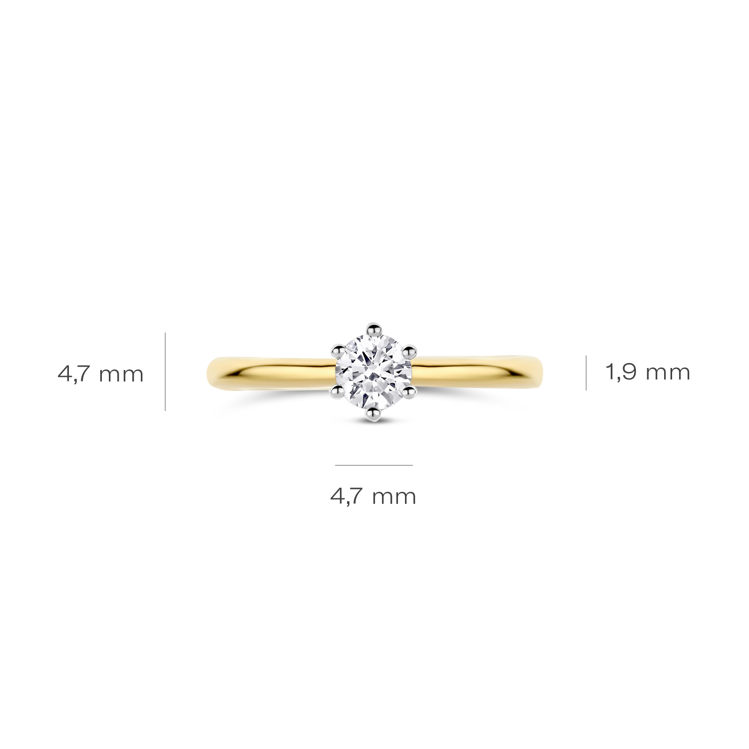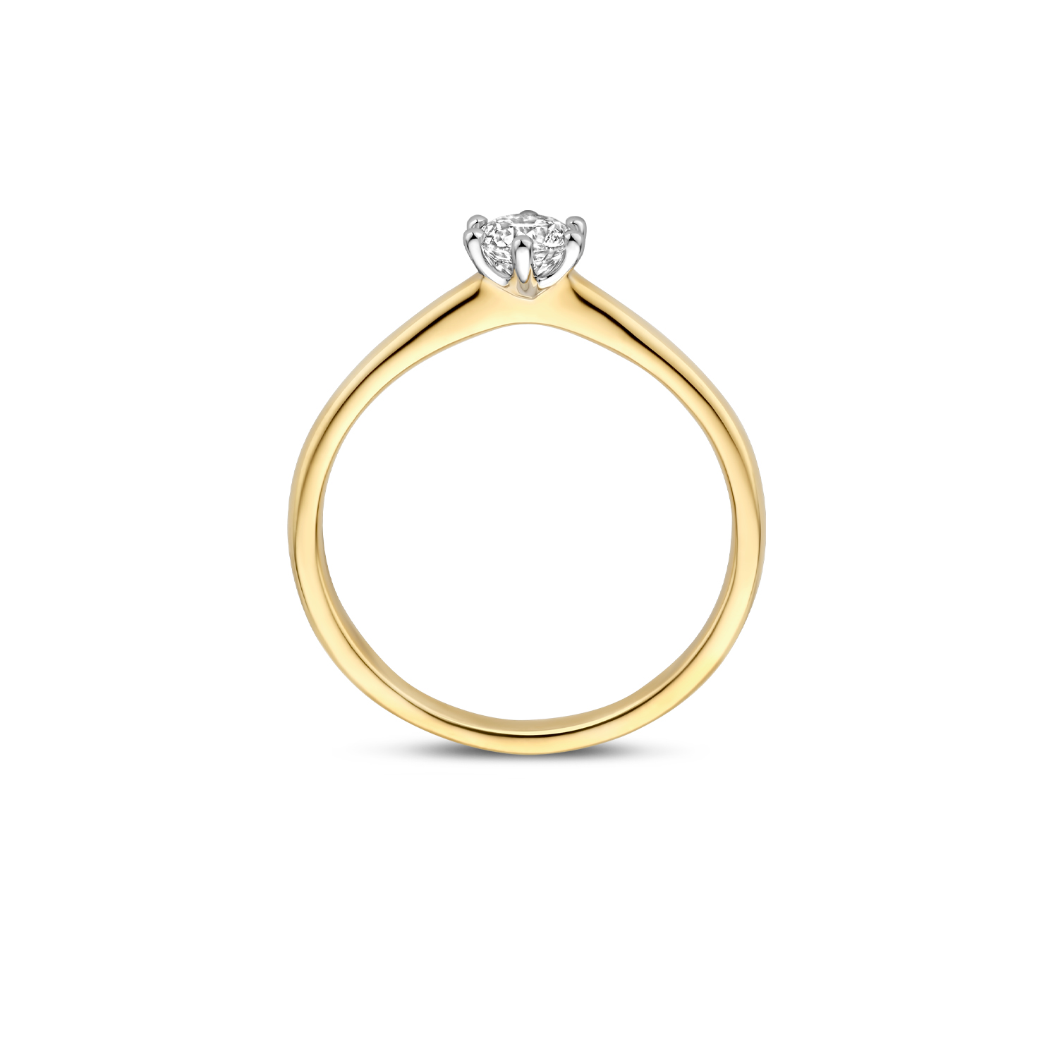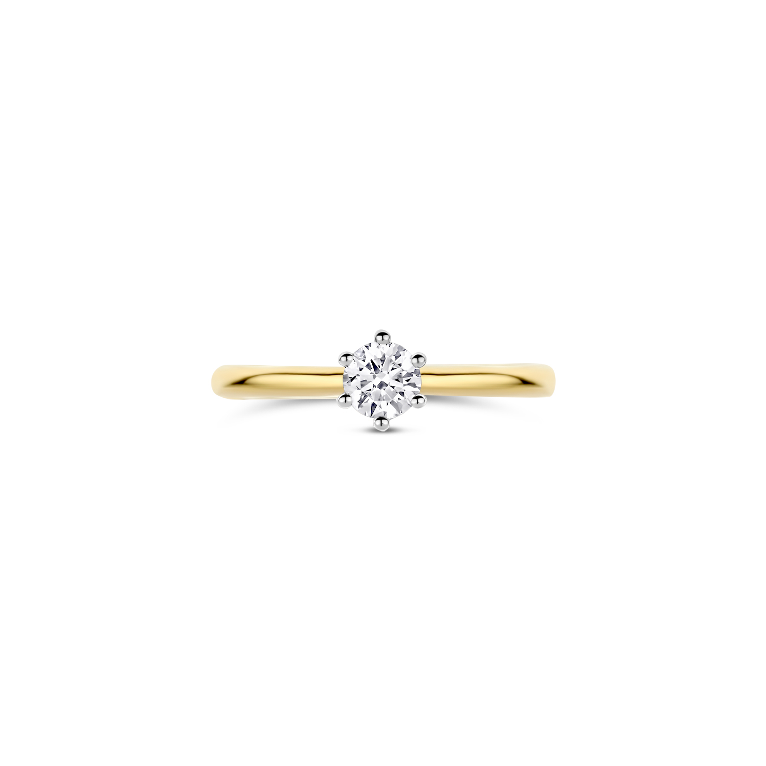 Deze Blush ring is een elegante ring van 14 karaat geelgoud met een lab diamant in chaton zetting. De diamant heeft een gewicht van 0.40 crt