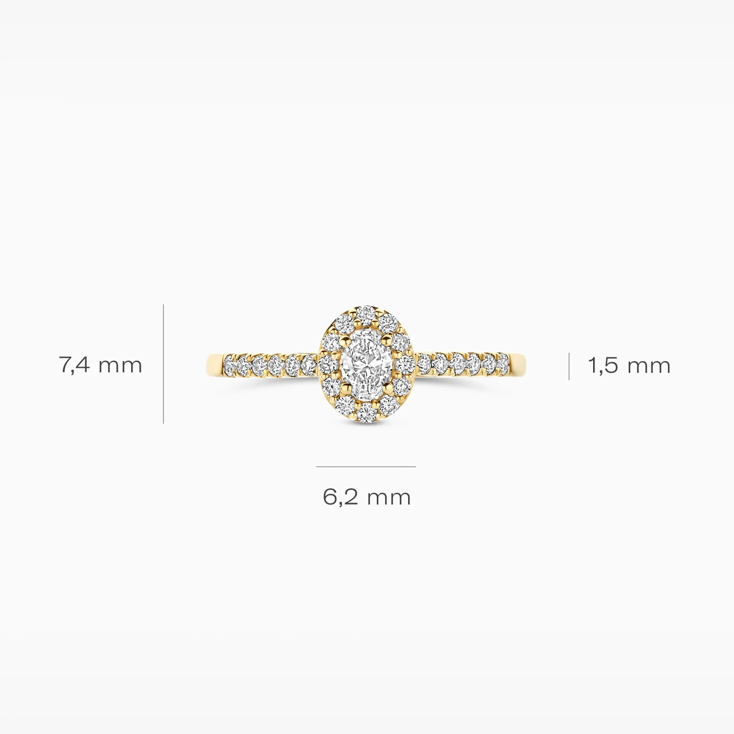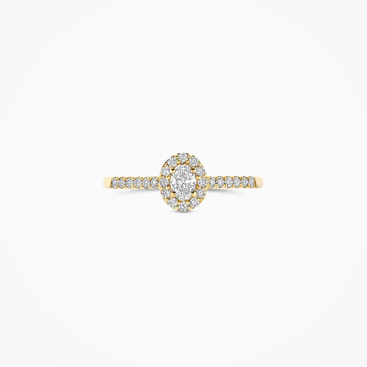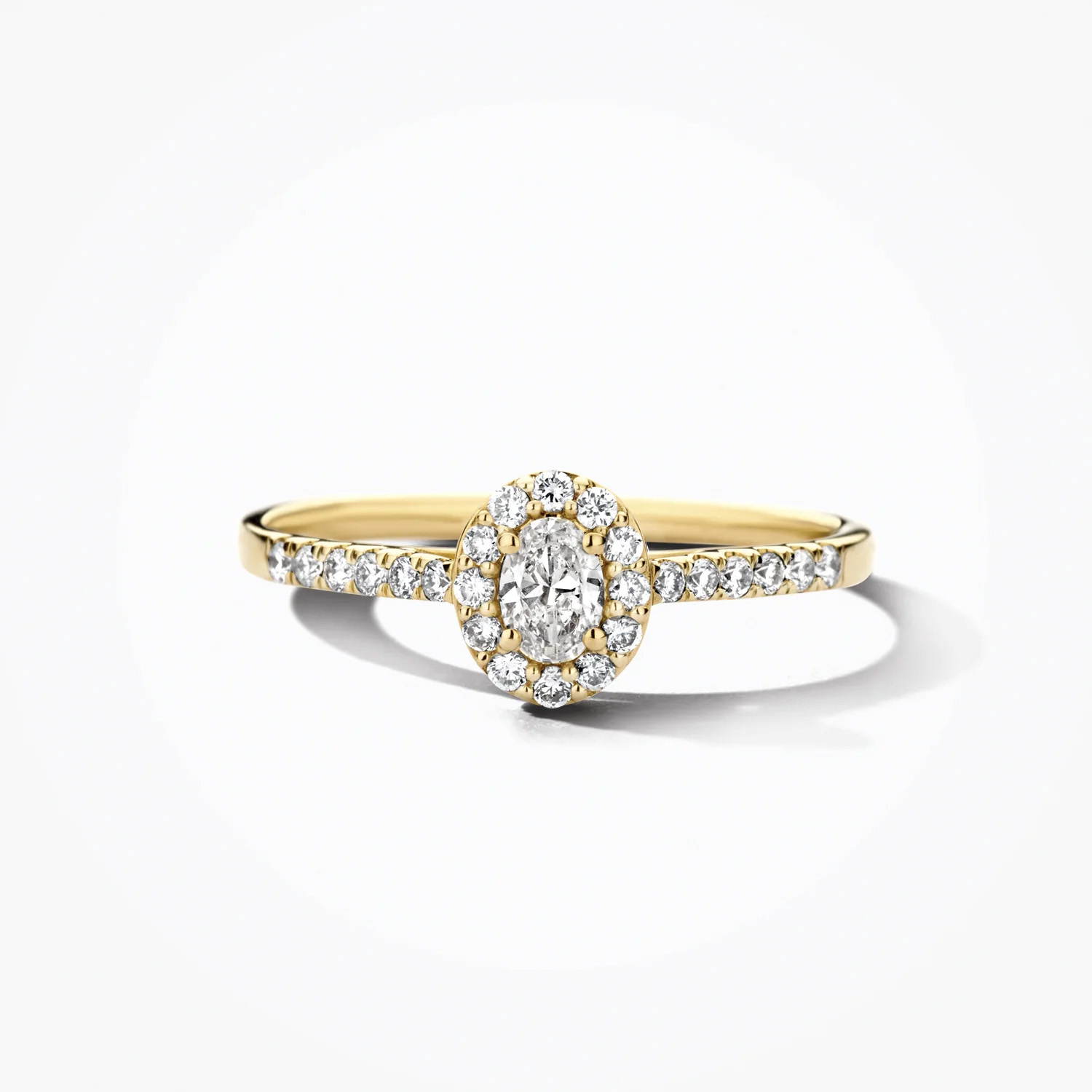 Deze Geelgouden ring bevat een elegante ovaal geslepen labdiamant met een halo van kleinere lasdiamanten. Draag deze veelzijdige ring als een opvallend accessoire bij zowel formele als informele gelegenheden voor een verfijnde en chique uitstraling.