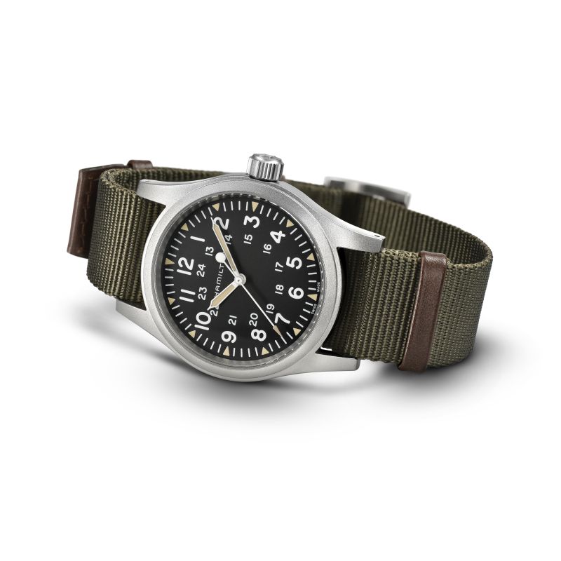 Dit Hamilton horloge heeft een 38 mm matte roestvrijstalen kast, display met drie wijzers, donkere wijzerplaat met lichtgevende cijfers, indexen met uren en minuten, duurzame NATO-band: De nieuwe Khaki Field Mechanical, een getrouwe recreatie van zijn originele voorganger uit de jaren ‘60, en vormt een getrouwe weergave van de stijl die zo kenmerkend is voor het militaire erfgoed van Hamilton.