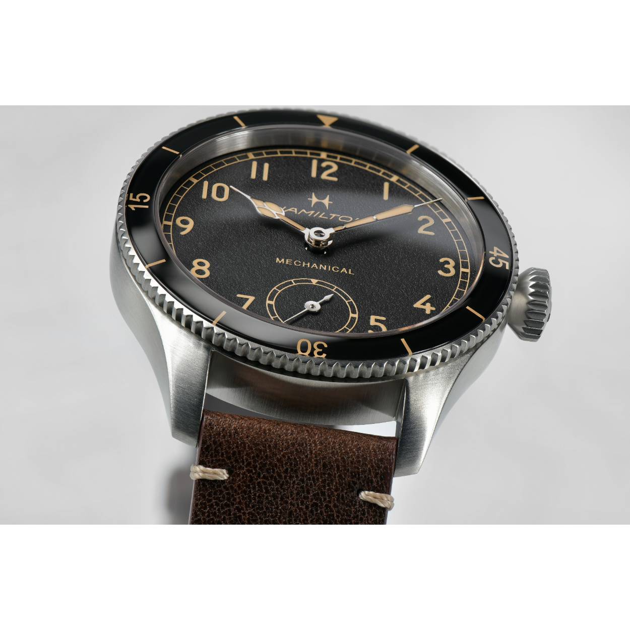 Geïnspireerd door het Model 23, een hypermodern zakhorloge dat door Amerikaanse soldaten tijdens de Tweede Wereldoorlog werd gebruikt, is het onderscheidende ontwerp van de Khaki Pilot Pioneer een eerbetoon aan Hamiltons luchtvaart- en militaire erfgoed. Het sportieve maar verfijnde pilotenhorloge behoudt een onbetwistbaar technisch gevoel met zijn handopwindbare mechanische beweging, bidirectionele roterende ring en prominente opwindkroon. Verkrijgbaar met een slanke roestvrijstalen of unieke bronzen kast, dit 43 mm-uurwerk is klaar om te vliegen.