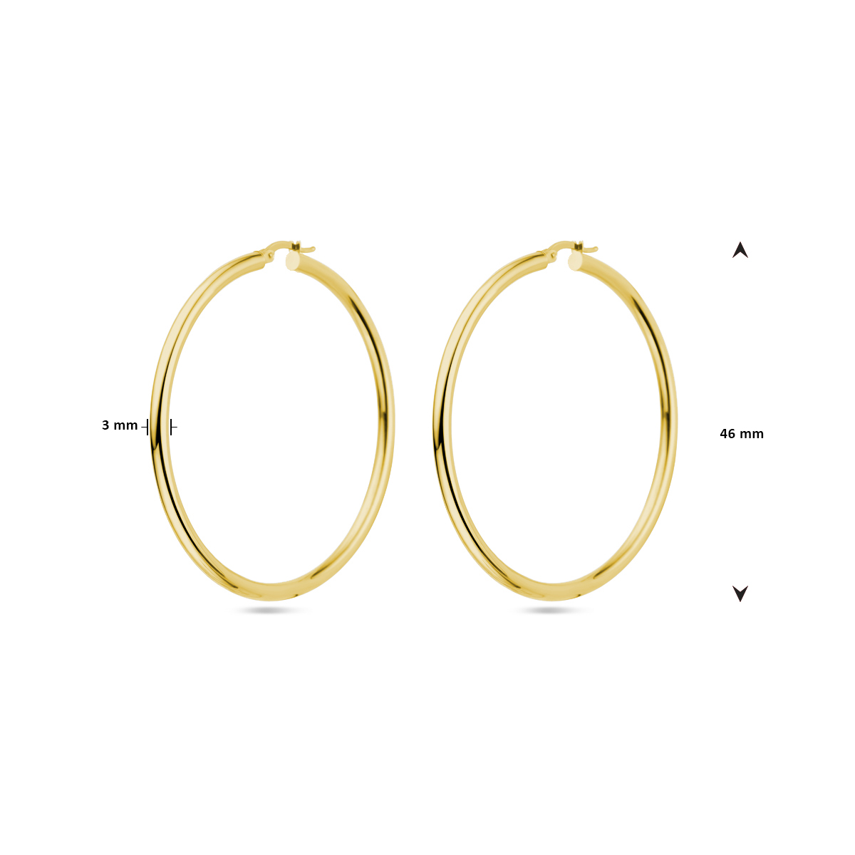 Oorringen 3,0 mm ronde buis. Met een diameter van 46 mm stralen ze in goudkleur dankzij hun glans. Ze wegen 3,9 gram en hebben een ronde vorm. Draag ze voor een stijlvolle en elegante uitstraling bij elke gelegenheid. Perfect om elke outfit te verfraaien.