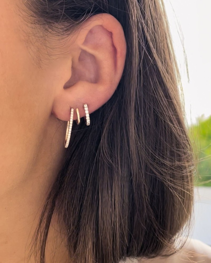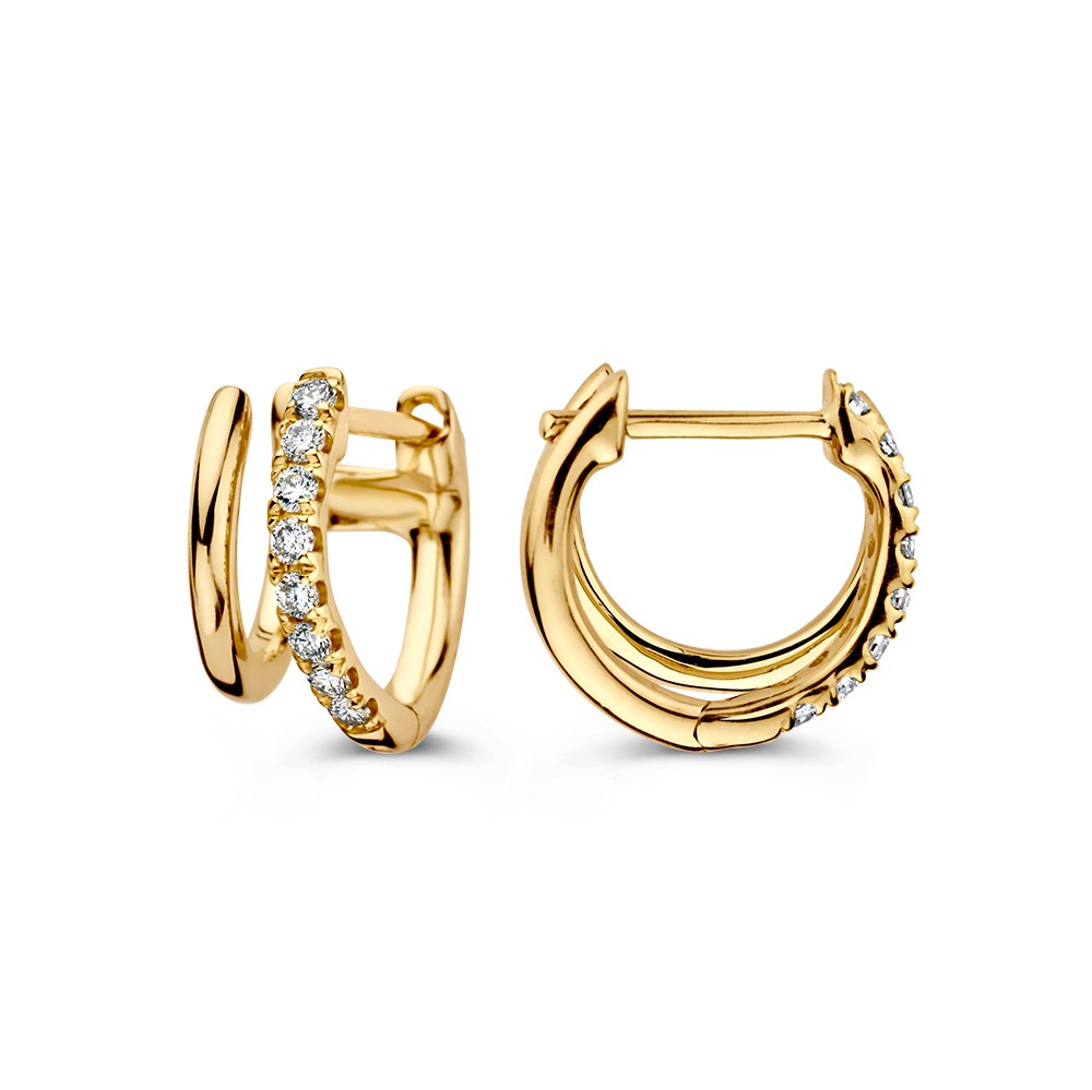 Speelse geelgouden oorringen met diamant. De oorringen zijn opgebouwd uit een grotere en kleinere ring, waardoor het lijkt alsof de draagster twee verschillende oorbellen in heeft.