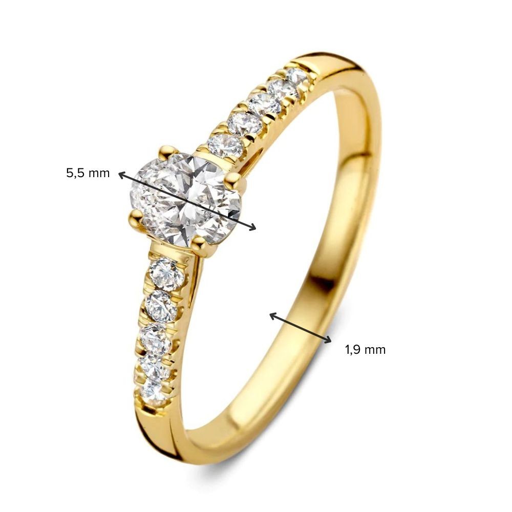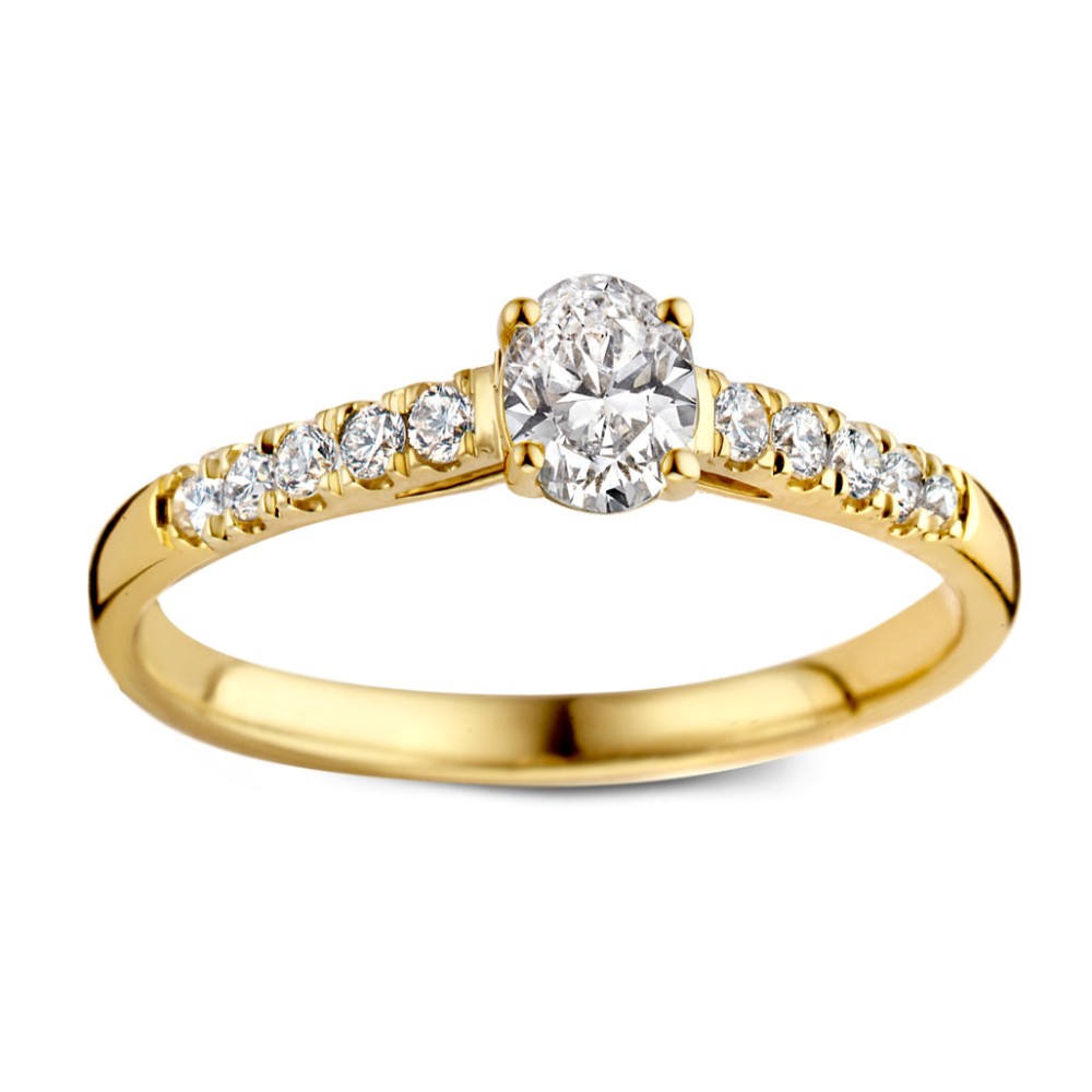 Geelgouden ring 'Franky Royal' met ovale middensteen (0,30 crt.) en zijstenen gemaakt van 18 karaat gerecycled goud.