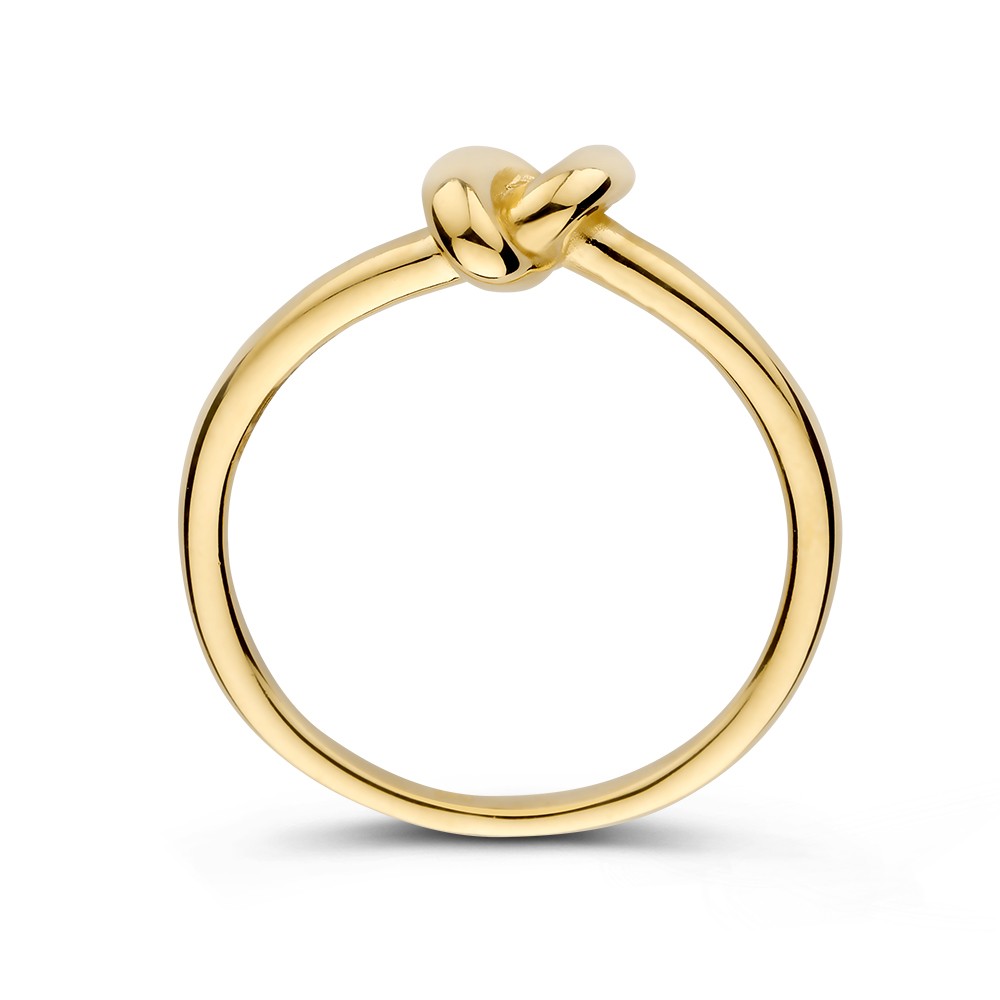 Deze 14karaat geelgouden is een prachtige gouden ring en heeft aan de bovenzijde een knoop. De ring heeft een glanzende afwerking.