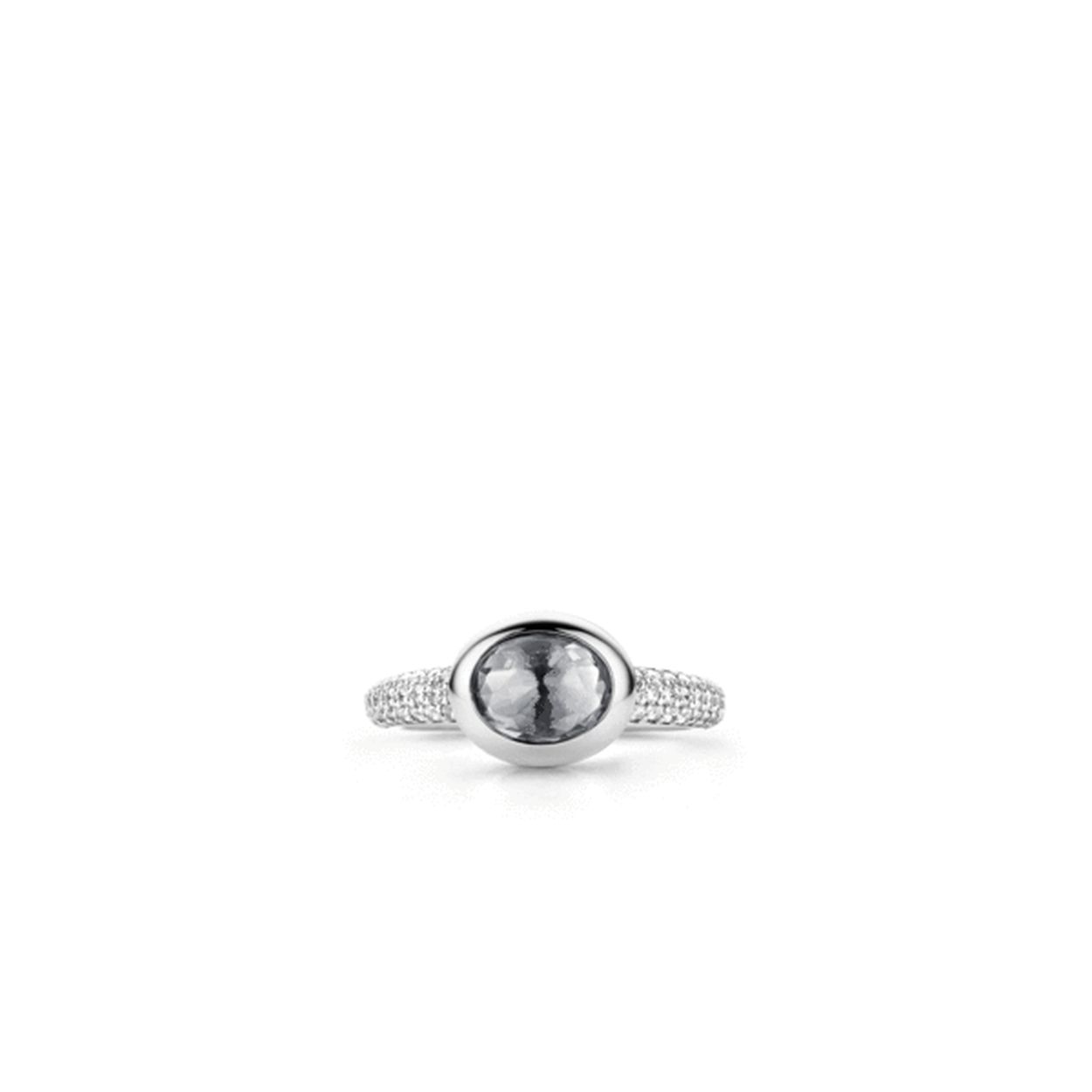 De sierlijke TI SENTO - Milano ring is voorzien van een ovale kristal in de kleur grijsblauw. De cabouchon kristal is gezet in een gladomzetting van gerhodineerd sterling zilver. De briljant geslepen zirkonia's zijn met de hand in een rijzetting verwerkt op de band van deze stijlvolle TI SENTO - Milano ring.